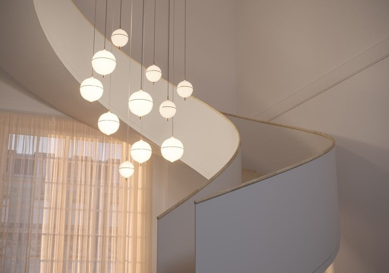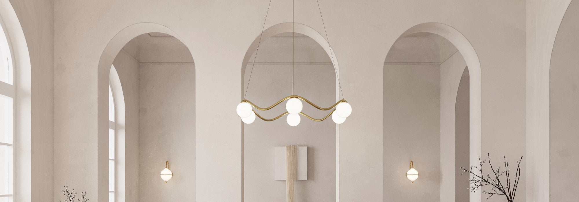 The undulating part of the chandelier that connects with the round mouth-blown opal glass is handmade in solid brass. This entails that the end result is made in a robust high quality and at the same time appear with a delicate visual expression.